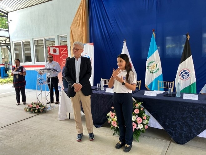 El pasado 14 de octubre, se llevó a cabo la Ceremonia de entrega del Centro Educativo para Estudiantes con Discapacidad Visual y Auditiva, Regional de Oriente en Zacapa. Además del consejero de la embajada del Japón; Sr. DEKI Shuichi, se contó con la presencia de la Tesorera de Junta Directiva del Benemérito Comité Pro Ciegos y Sordos de Guatemala; Licda. Betty Pérez de Solares, de la Vocal de Junta directiva; Licda. Ana del Carmen Sánchez de Gramajo, ek Vicealcalde de la Municipalidad Zacapa; Lic. Fernando Orellana, la Directora General de Educación Especial del Ministerio de Educación .Licda. Mónica Paola Sánchez,, maestros, alumnos ( Aprox. 40 alumnos.), entre otros. Después de la ceremonia, el consejero DEKI, acompañado de los representantes de la organización, hizo un recorrido por las aulas e instalaciones de la Fundación.