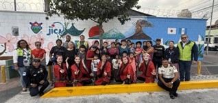 La mañana del día 17, frente al mural ubicado en el barrio Modelo de la capital —pintado por la Oficina de JICA en Guatemala en conmemoración del 90.º aniversario del establecimiento de relaciones diplomáticas entre Japón y Guatemala y del 60.º aniversario del inicio de los Voluntarios Japoneses de JICA, en colaboración con la Alcaldía Auxiliar de Guatemala y la Policía Nacional Civil— se realizó una presentación de aproximadamente 15 minutos. Numerosos vecinos se acercaron al lugar para para compartir la experiencia.
