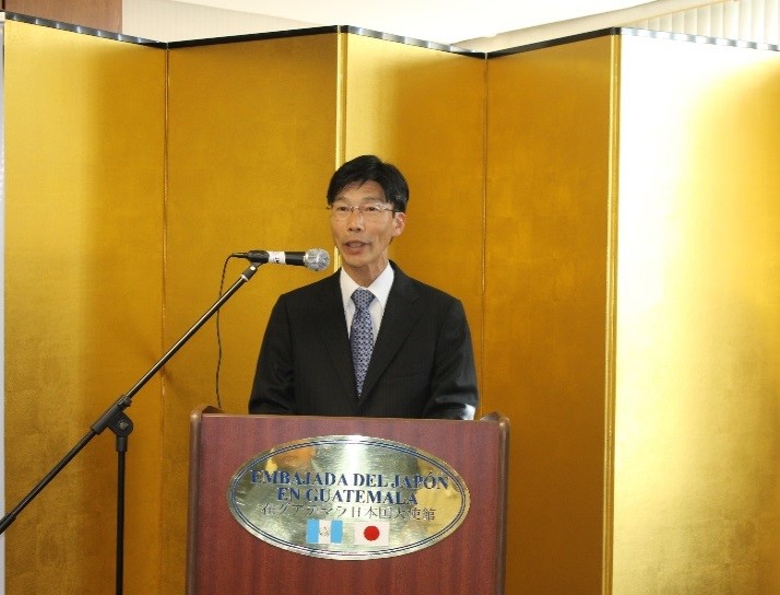 | (写真左:フンカフェ財団代表,中央:古谷大使,右端:ハカルテナンゴ市長) | (古谷大使による挨拶) |