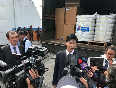 | (被災地へお見舞いを伝える古谷大使) | 物資を受け取るホベル外相(左端) |